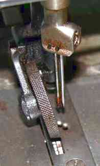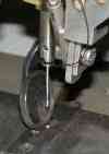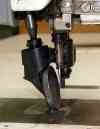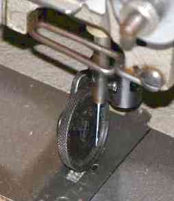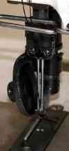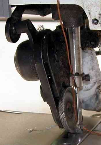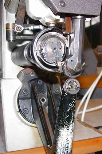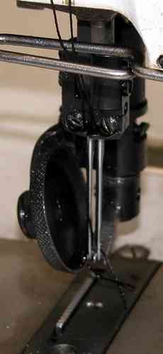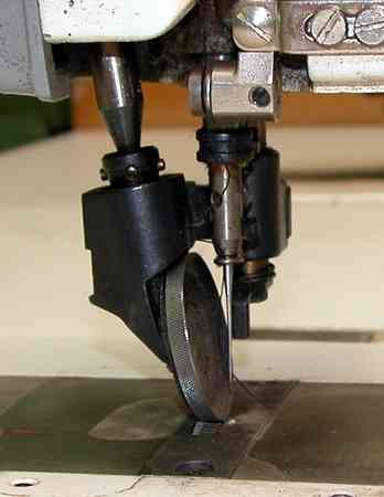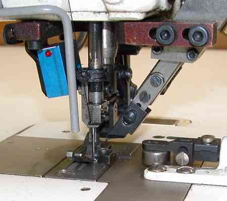Einnadel- Säulenmaschine, Säule rechts zur Nadel, Futterkantier von unten. |