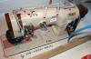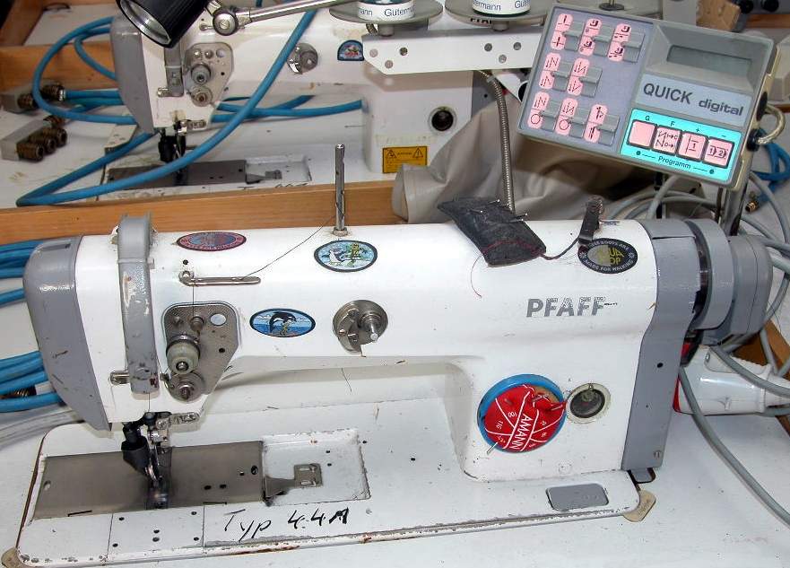 Zick-Zack Nähmaschine, pneumatischer Hüpfertransporteur Lifter, Fadenabschneider, mit Elektromagnet angesteuertem oberfadengreifer, greift den Oberfaden und zieht ihn hinter der Nadel hoch. |